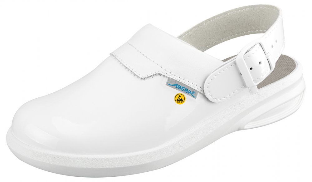 Velikost 35-43 CE, EN ISO 20347: 2012, OB, FO, A, E, SRC Patent z mikrovlákna, bílý Pásek na patě nesklopný, nastavitelný Protiskluzová podrážka TPU Vyměnitelná stélka Active Comfort (art. 352710) ESD disipativní podle DIN EN 61340