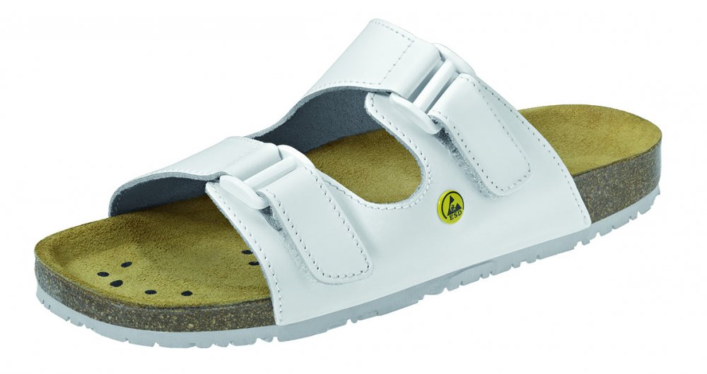 Velikost 34-48 CE, EN ISO 20347: 2012, OB, A, FO, SRC Hladká kůže, bílá 2 nastavitelné nártové pásky Zapínání na suchý zip Protiskluzová speciální gumová podrážka Kožená stélka na korku ESD disipativní podle DIN EN 61340