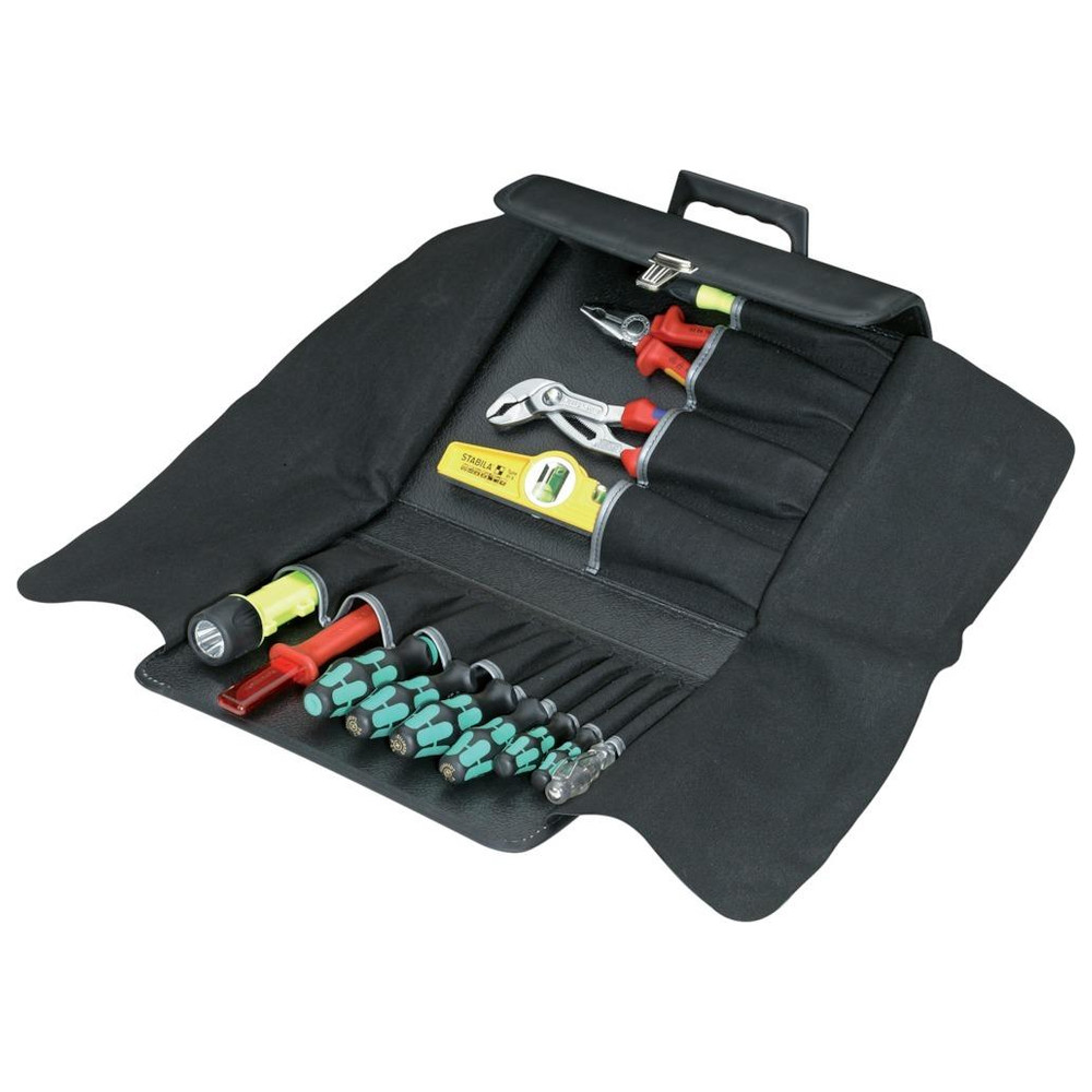 - Vysoce kvalitní syntetická kůže, černá- Skládací- 13 kapes, 2 poutka na uchycení nástrojů, 2 víka s klopami se 2 lisovacími knoflíky a suchým zipem